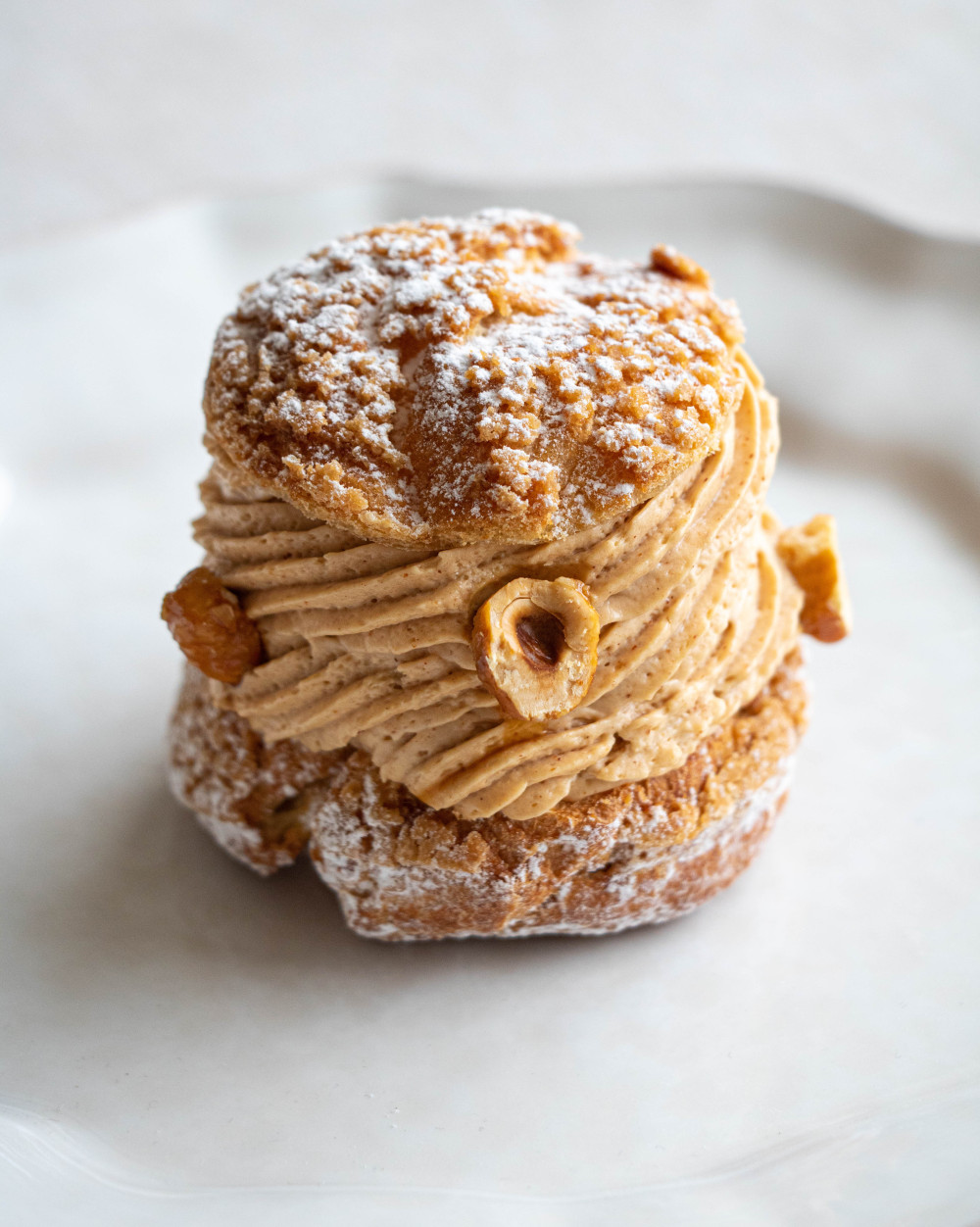 Chou garni de crème pâtissière (vanille, chocolat ou café), chantilly (vanille, chocolat ou café) et petit chou glacé dans un caramel croquant