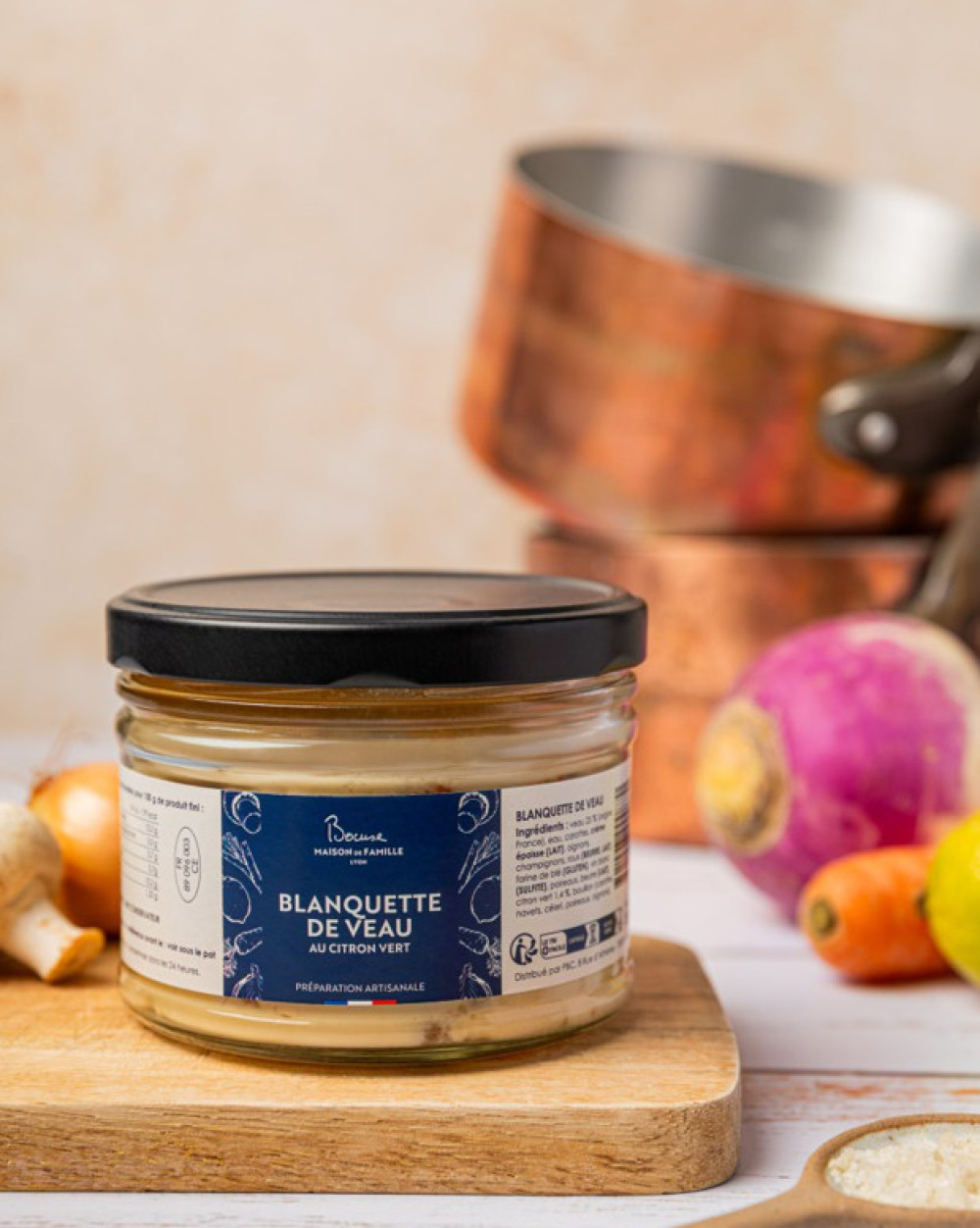 Ingrédients : Veau 25% (origine France), eau, carottes, crème épaisse (lait), oignons, champignons, roux (farine de blé (gluten), beurre (lait), vin blanc (sulfites), poireaux, beurre (lait), citron vert.