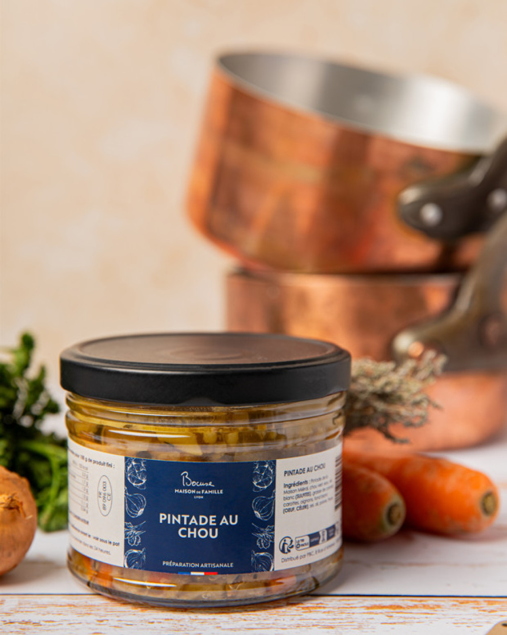 Ingrédients : Pintade maison Mieral 44% (origine France), chou vert 30%, eau, vin blanc (sulfites), graisse de canard, lardons, carottes, oignons, fond blanc (volaille, eau, carottes, oignons, poireaux, vin blanc (sulfites), thym, laurier, poivre), ail, sel, poivre, thym