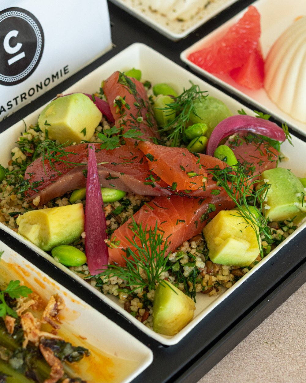 Saumon gravlax maison, mélange de céréales*, avocat et edamame - Fruits à coque, gluten, soja, poisson, sulfite